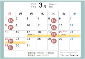 営業日のご案内 2026/02/23 2月は通常通り営業いたします! *****営業時間のお知らせ***** 営業時間 9時30分~17時30分 定休日 木曜日・日曜日 ***************************** 3月はお彼岸営業いたします! *****営業時間のお知らせ***** 営業時間 9時30分~17時30分 定休日 木曜日・日曜日 *****************************